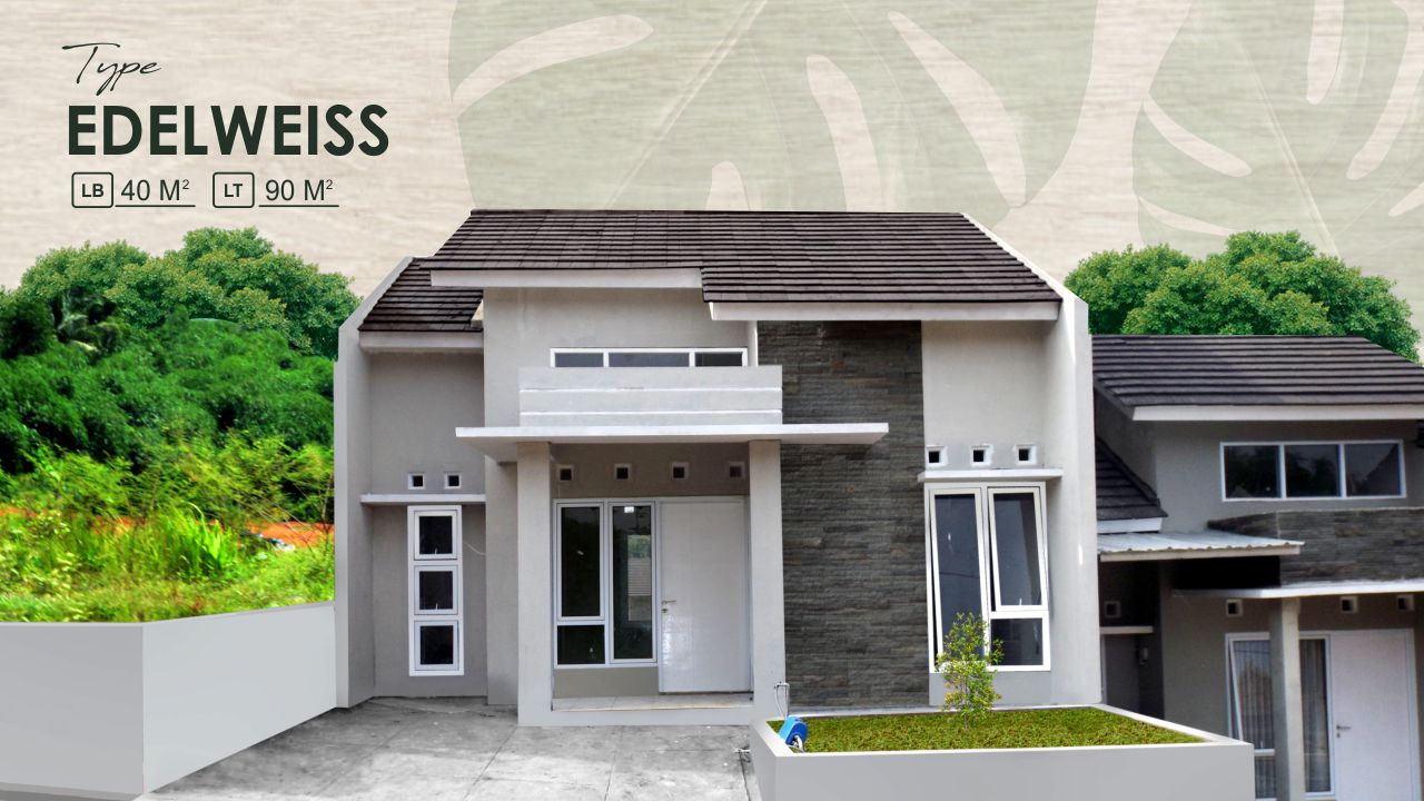 Hunian yang tersedia type Edelweiss (40/90) dilengkapi 2 kamar tidur, 1 kamar mandi, ruang tamu dan taman.